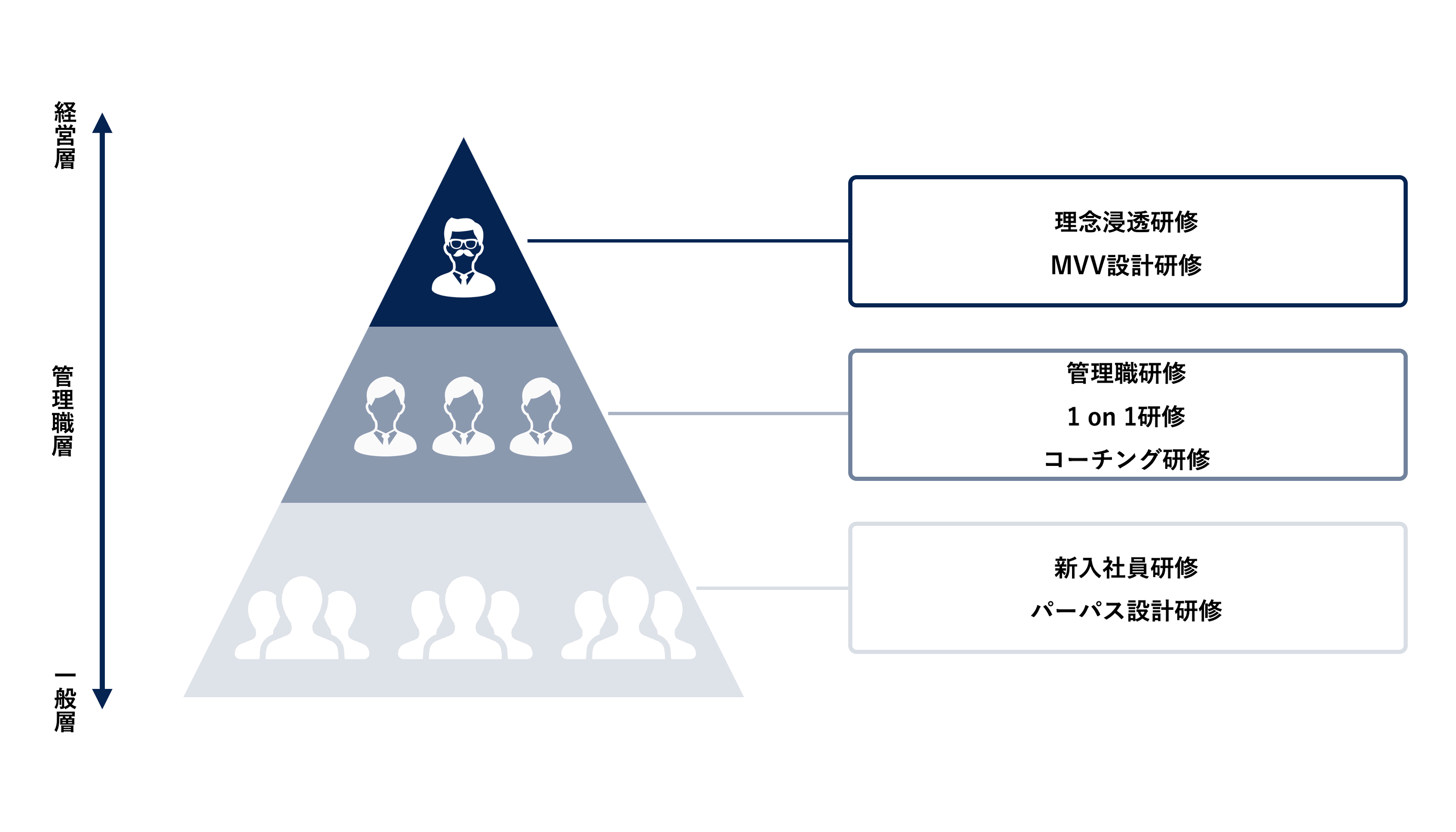 経営層-管理職層-メンバー層のそれぞれで必要となる研修を実施します。