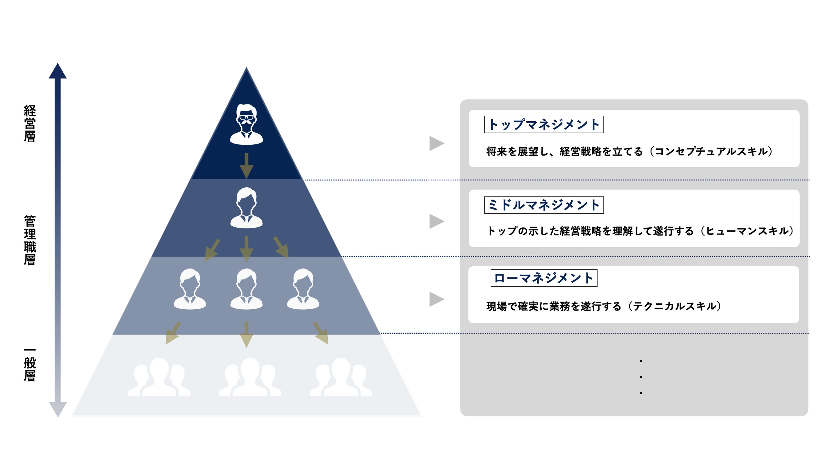 経営層-管理職層-メンバー層で必要となる能力を特定することで研修内容を設計していきます。